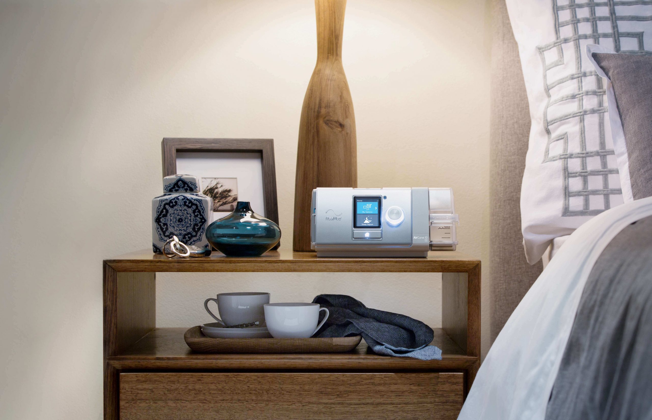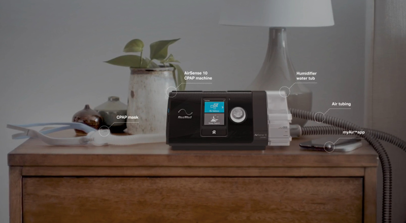 CPAP equipment is used to treat sleep apnea. There are four products that all work together to deliver your therapy: the machine, mask, air tubing and Resmed myAir™ app. The CPAP machine creates the airflow that is pushed through the tubing to the mask and into your lungs.