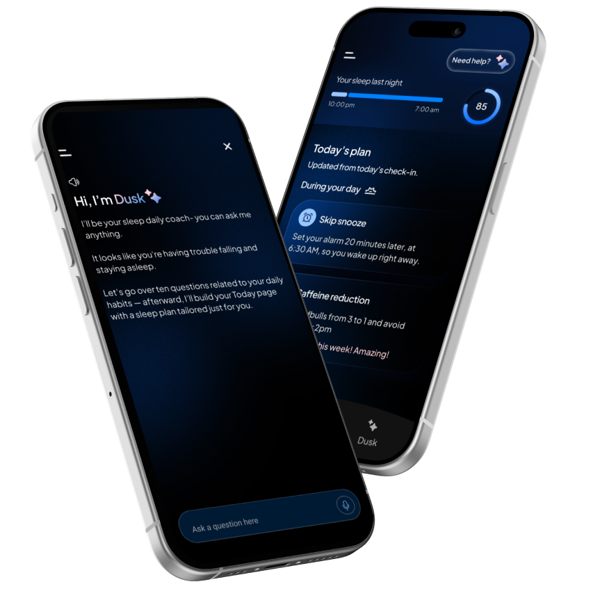 Dusk is a free intelligent sleep support coach. Your private, personal and empathetic sleep concierge. Accessible from any device on the go. Designed for safety, efficacy and lasting habit formation.